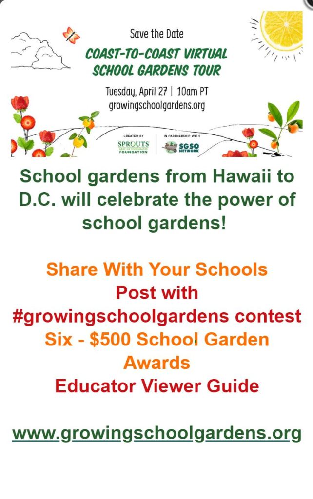 Join us on April 27 for a live, cross-country celebration of school gardening! Encourage others to join too! For