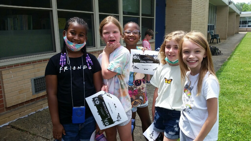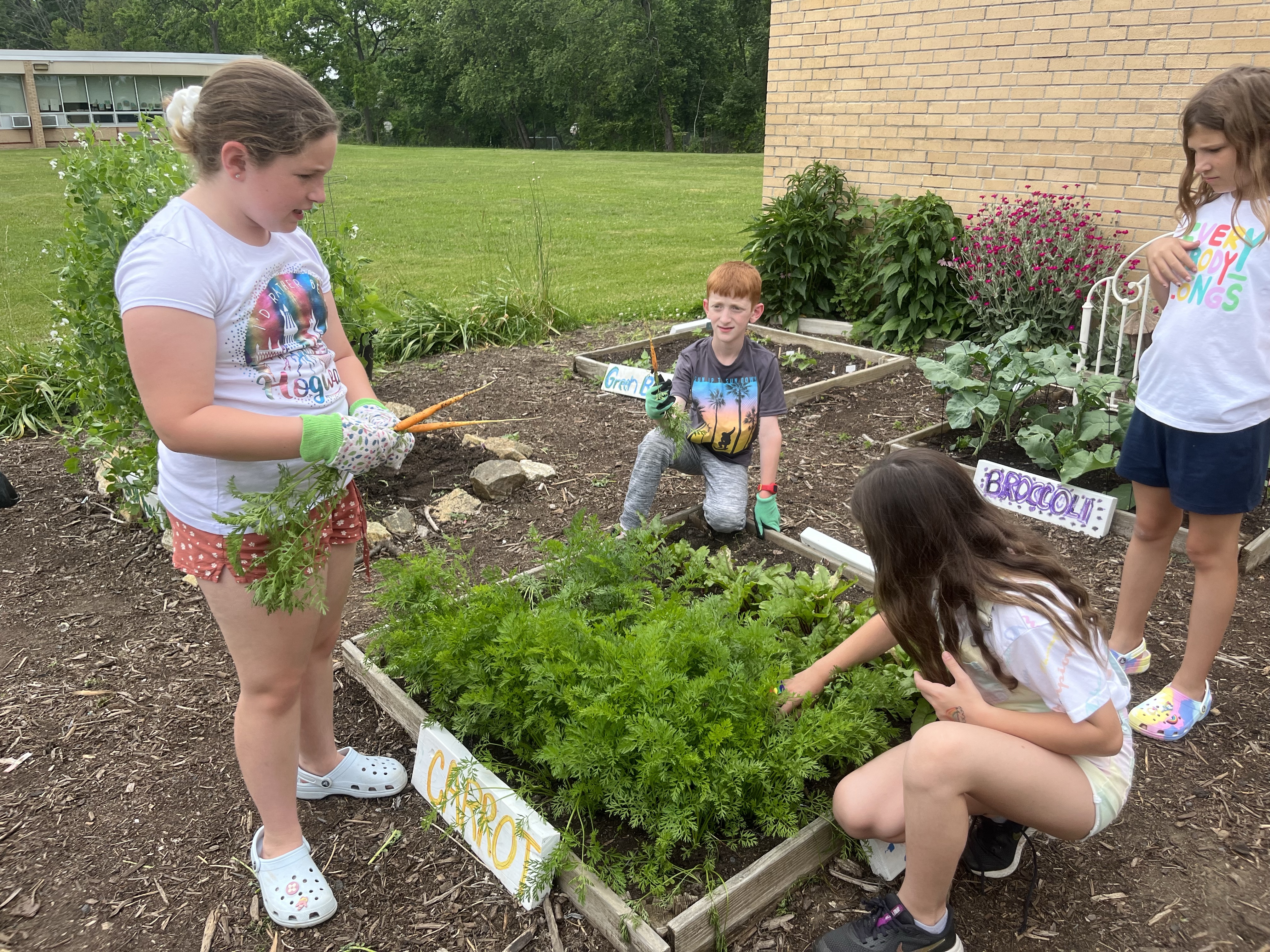 In June, we wrapped up the Student Program @Recess for the school year! 115 students received awards and enjoyed the fruits of their labor with a SALAD PARTY! Not everyone liked everything, but most of the kids tried the serval of the fresh vegetables we grew in the garden! Each student had the opportunity to taste the harvested spring crops of lettuce, radish, spinach, kale, carrots, and snow peas! (We had tomatoes from the store bc ours are not ready yet!) So many smiles, so much learned and so much eaten! What a wonderful end to a great program!
