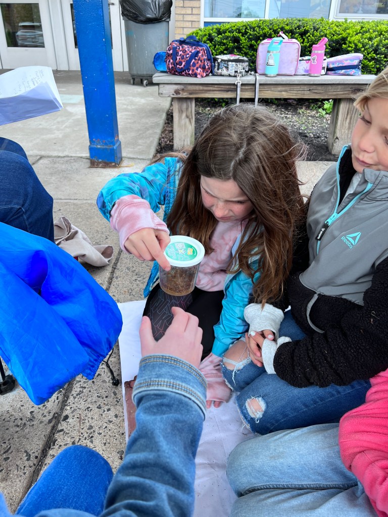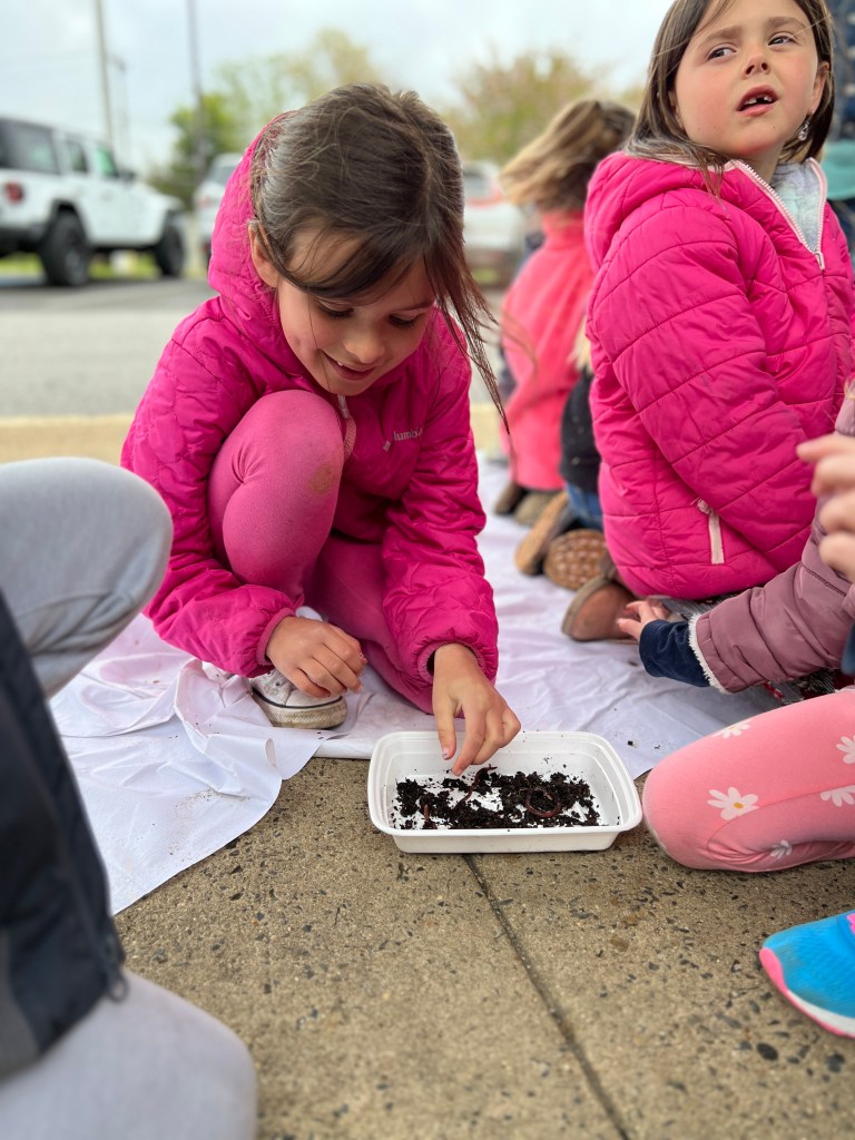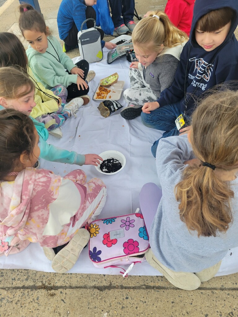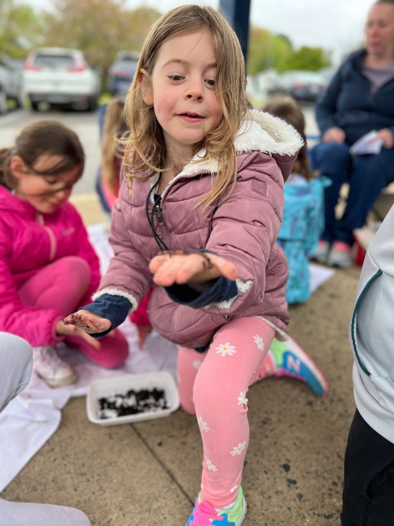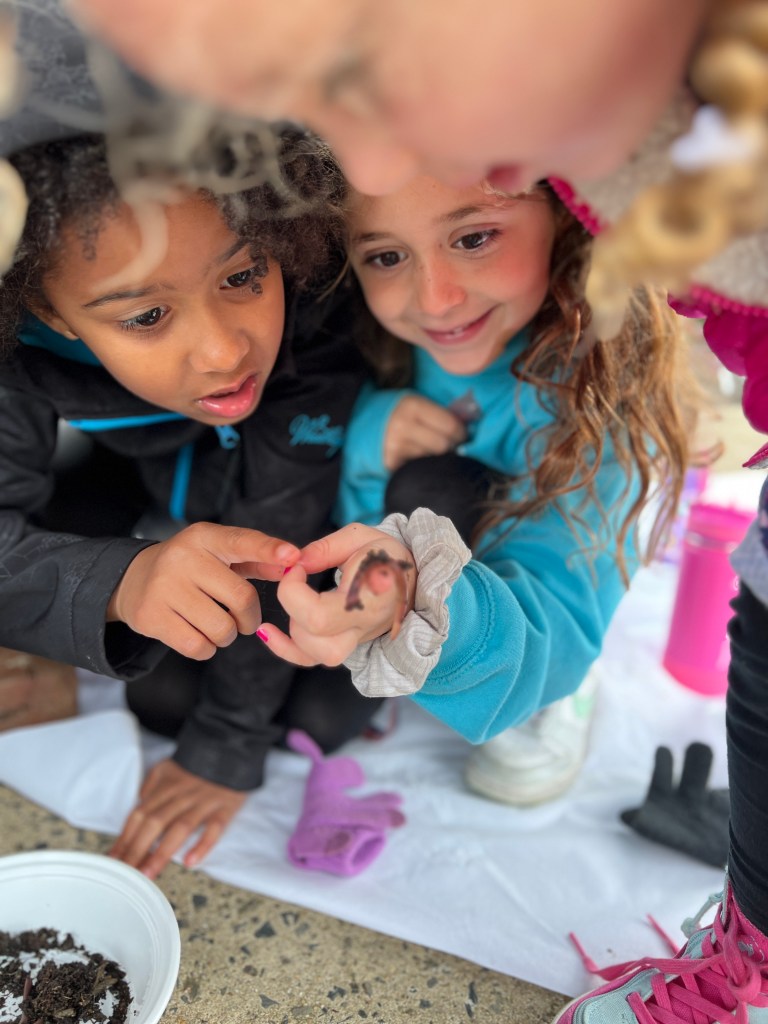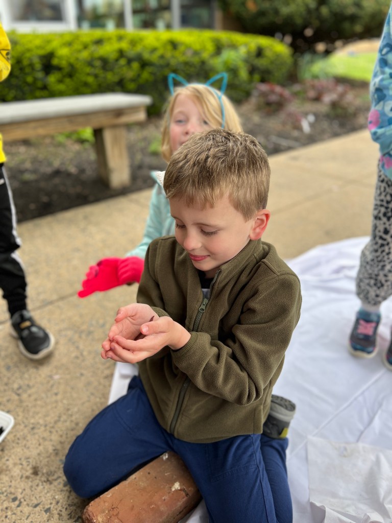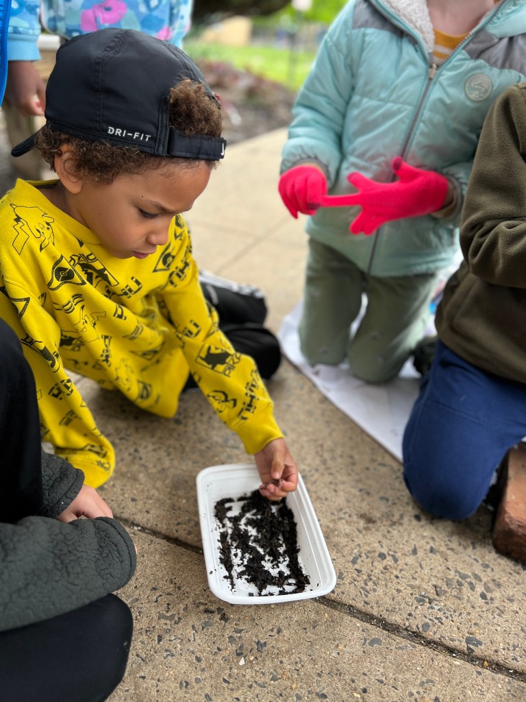 Due to the weather we had to pivot our plans, deciding to stay under the cover out front and enjoyed a picnic lunch while discovering nature. We split into groups: Mrs Nyszczot’s group did gardening like pulling weeds at our front entrance, seeing painted lady caterpillars up close, and planting indoor seeds for the “three sisters” (corn, squash, beans), learning about the safety rules needed in the garden.