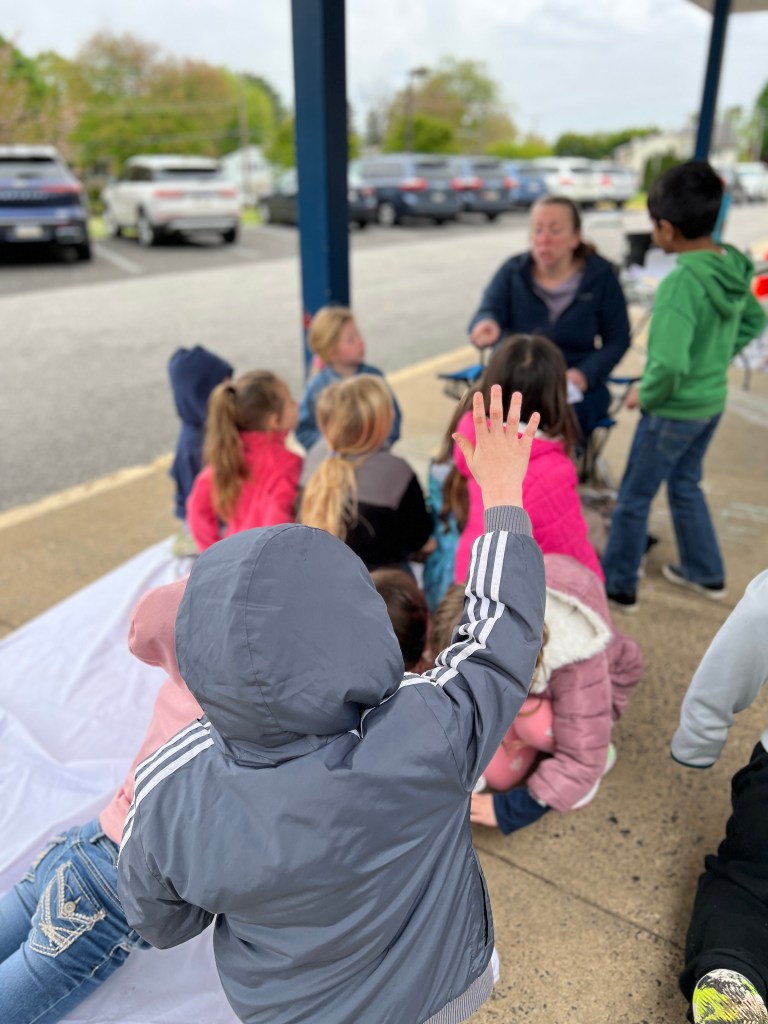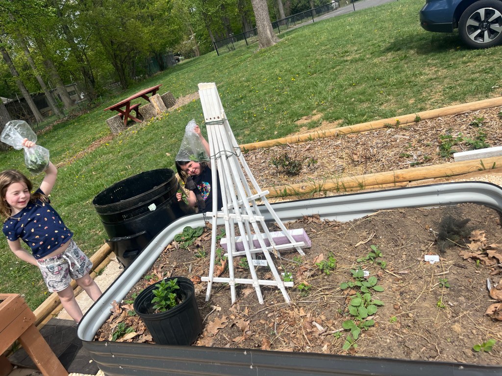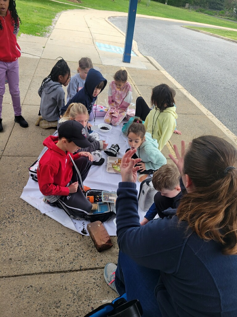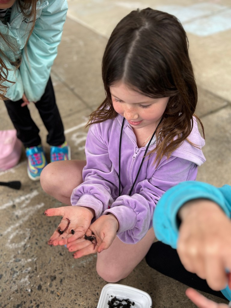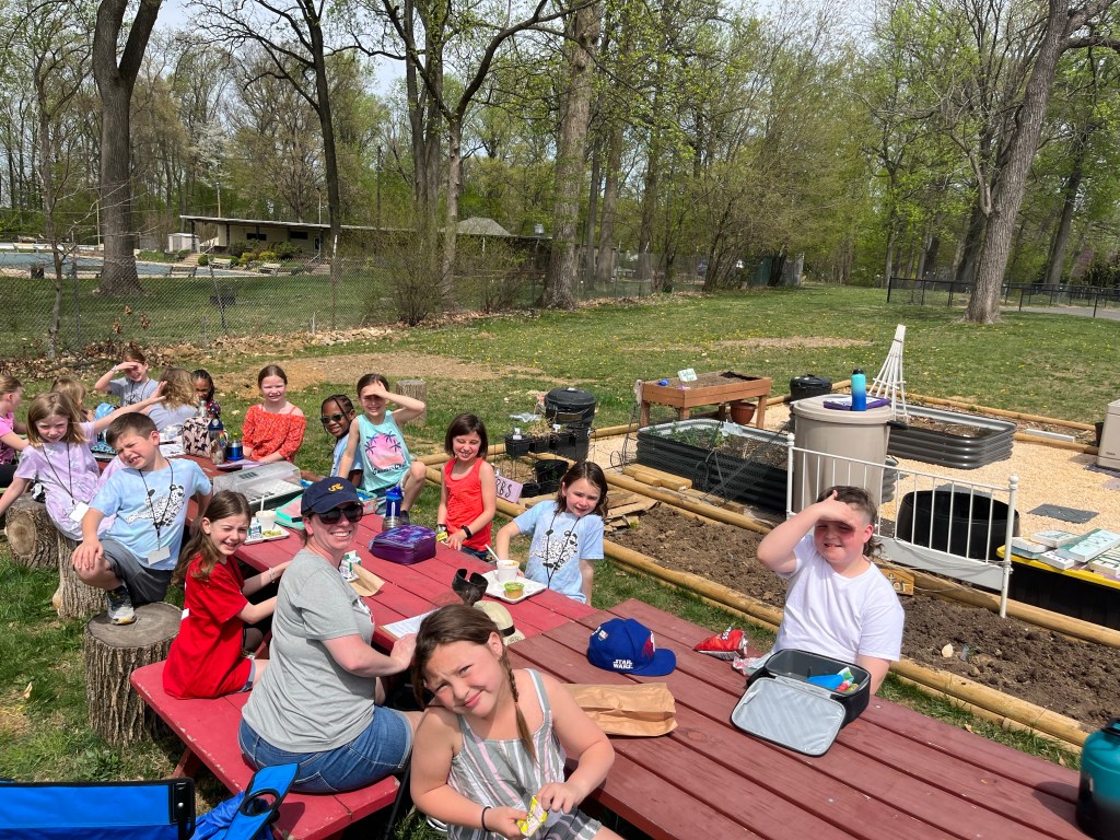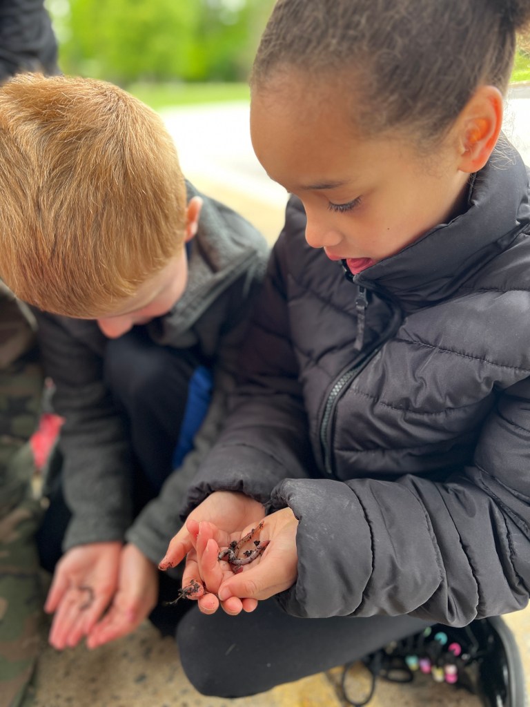 Due to the weather we had to pivot our plans, deciding to stay under the cover out front and enjoyed a picnic lunch while discovering nature. We split into groups: Mrs Nyszczot’s group did gardening like pulling weeds at our front entrance, seeing painted lady caterpillars up close, and planting indoor seeds for the “three sisters” (corn, squash, beans), learning about the safety rules needed in the garden.