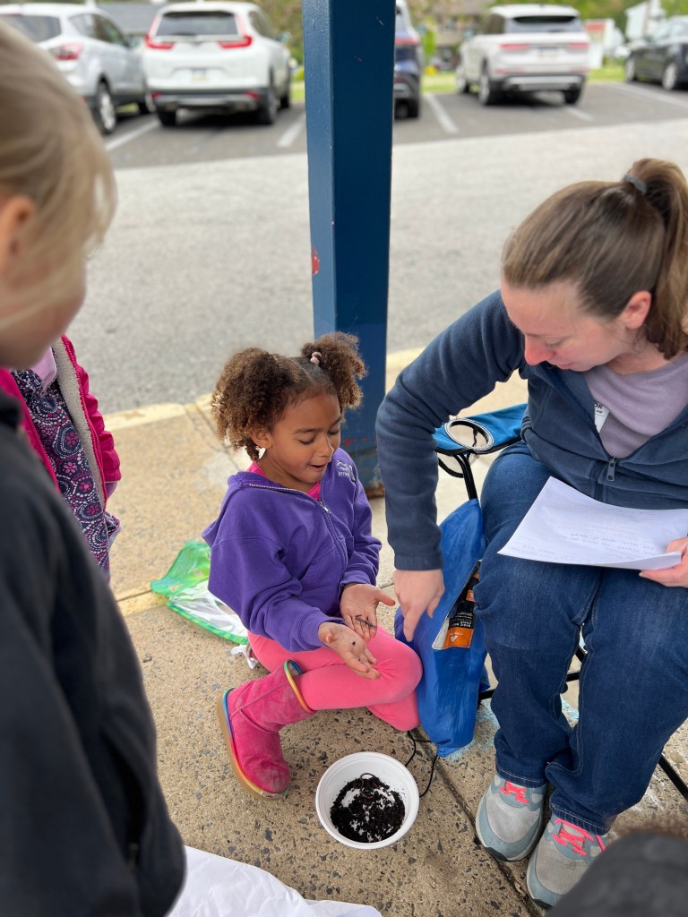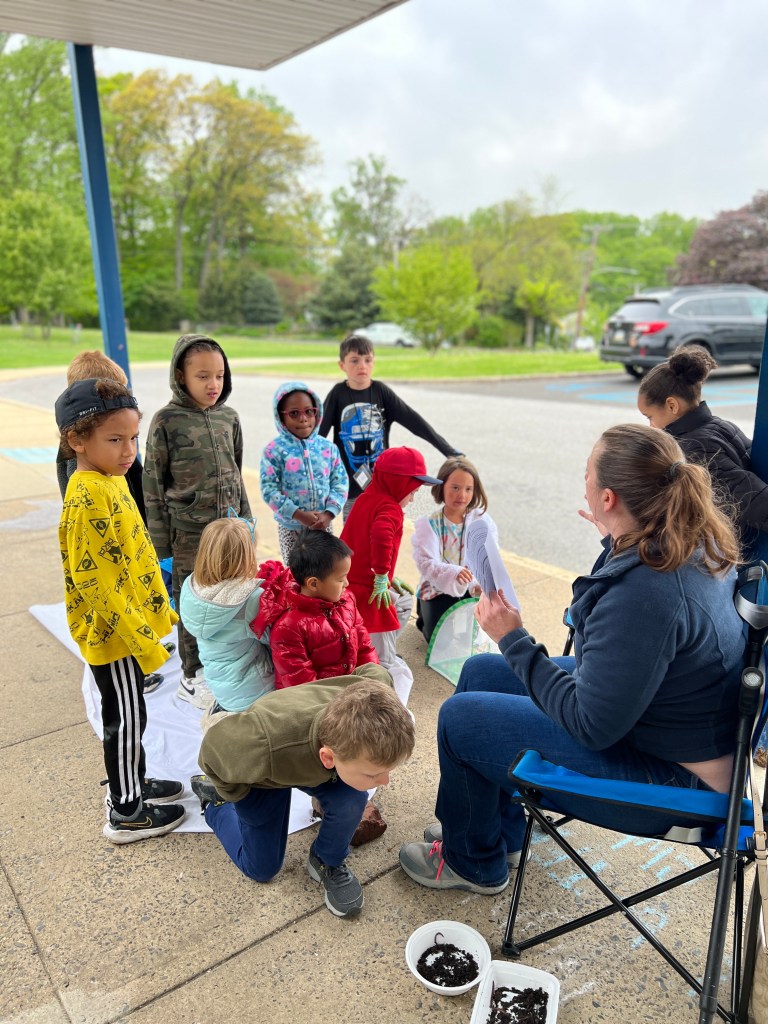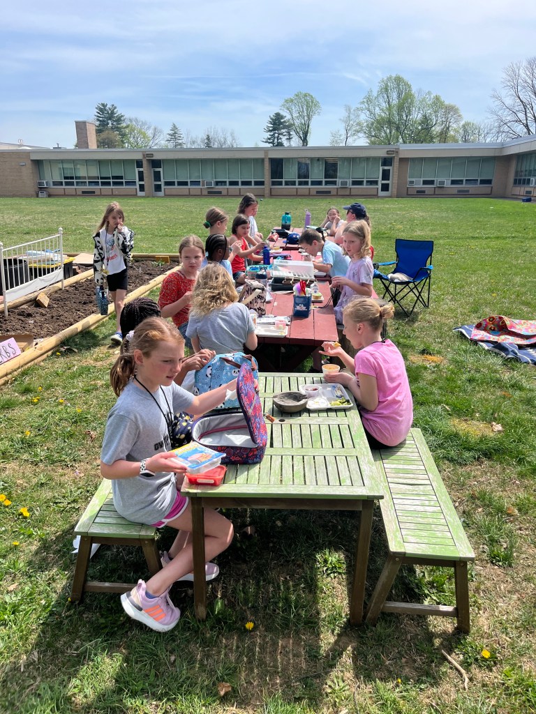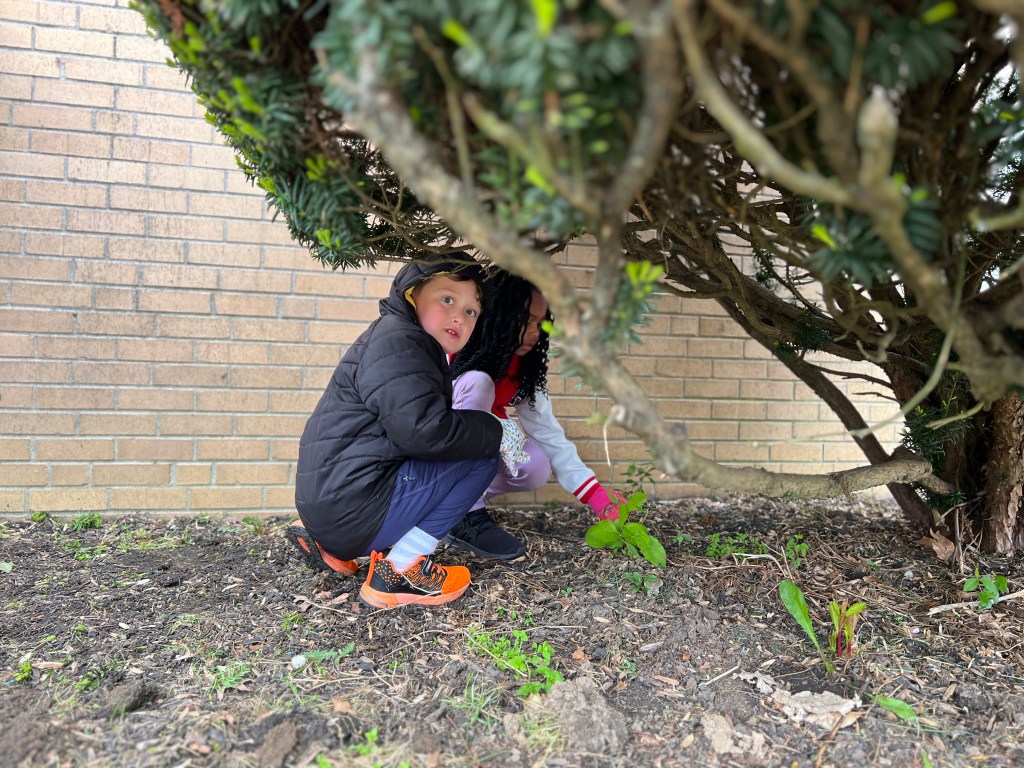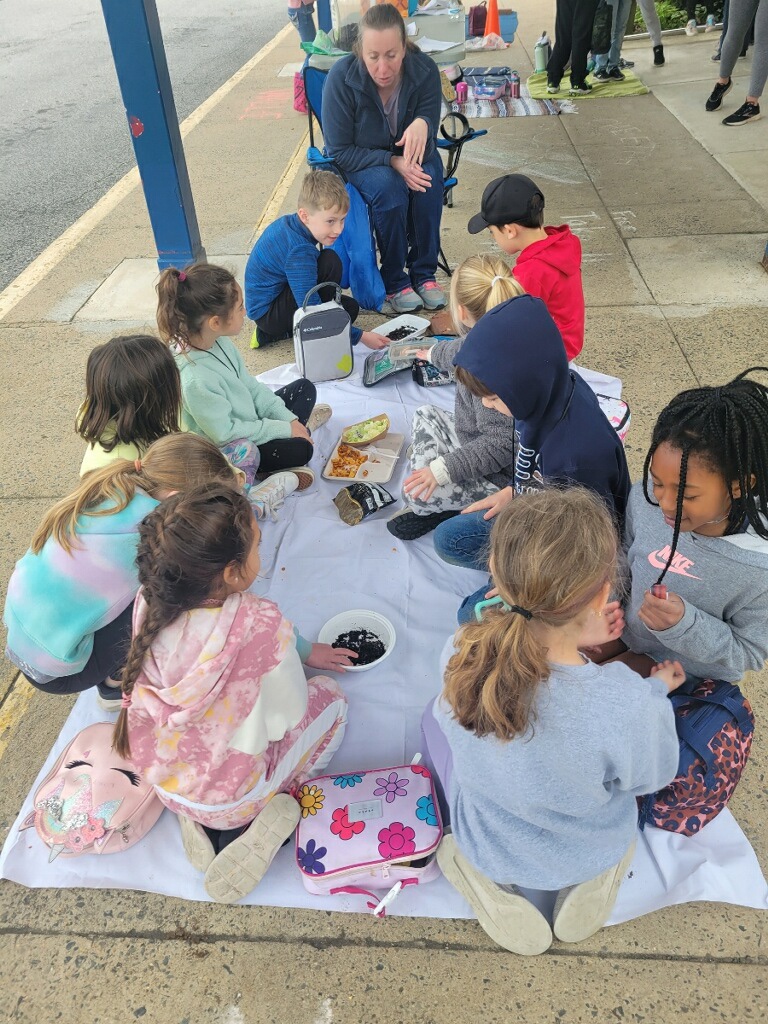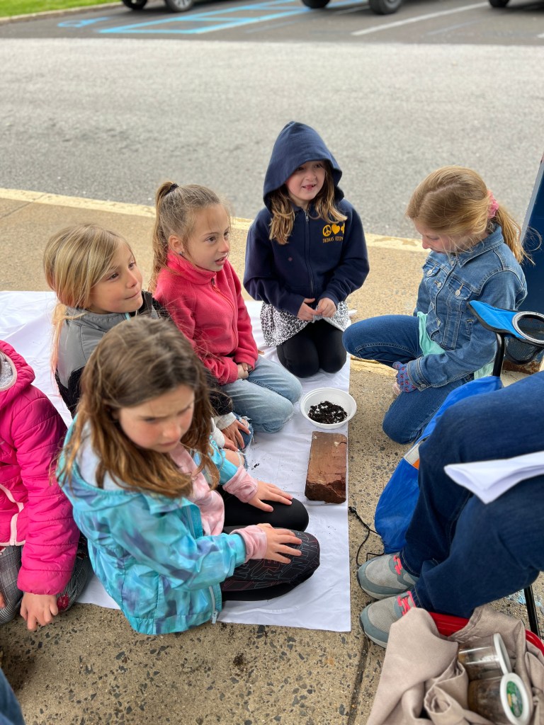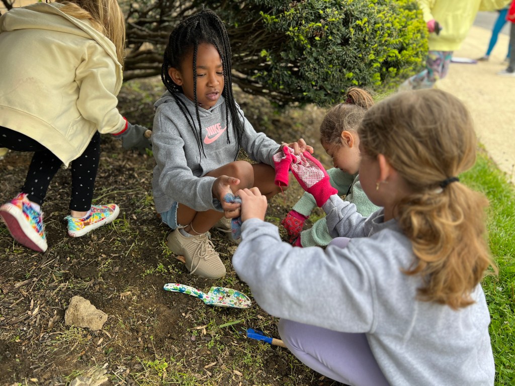 Due to the weather we had to pivot our plans, deciding to stay under the cover out front and enjoyed a picnic lunch while discovering nature. We split into groups: Mrs Nyszczot’s group did gardening like pulling weeds at our front entrance, seeing painted lady caterpillars up close, and planting indoor seeds for the “three sisters” (corn, squash, beans), learning about the safety rules needed in the garden.