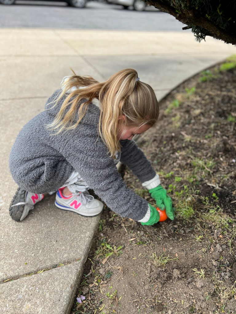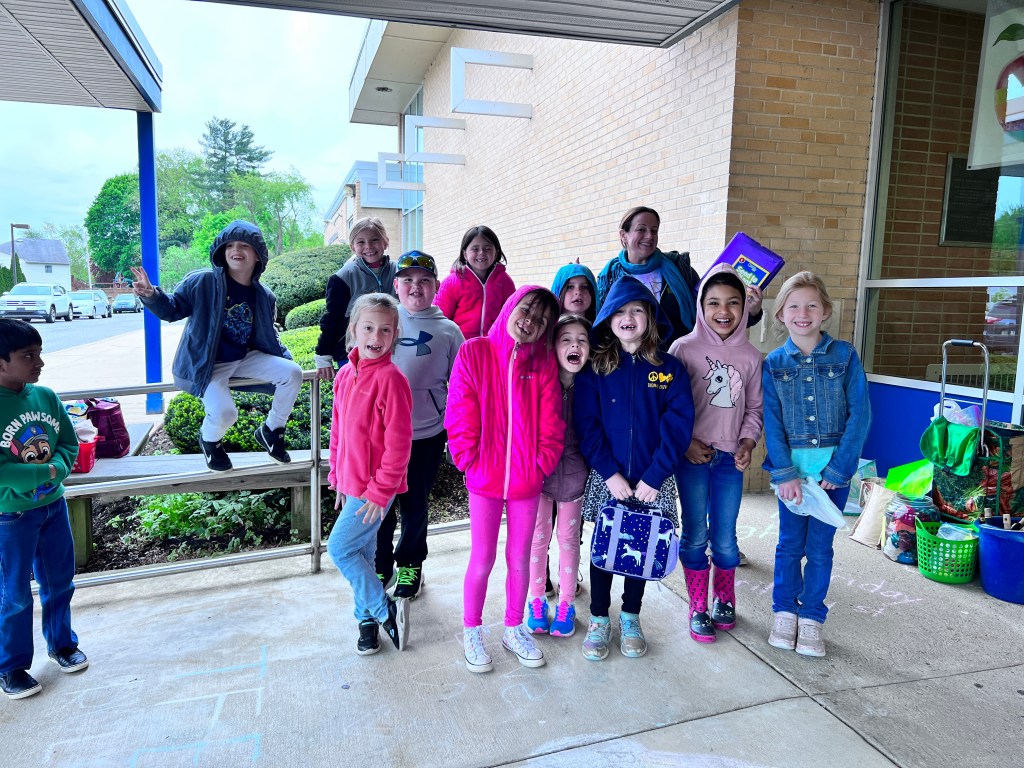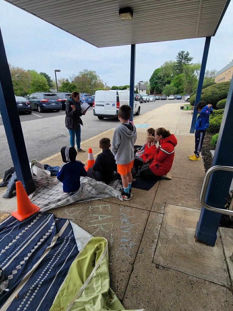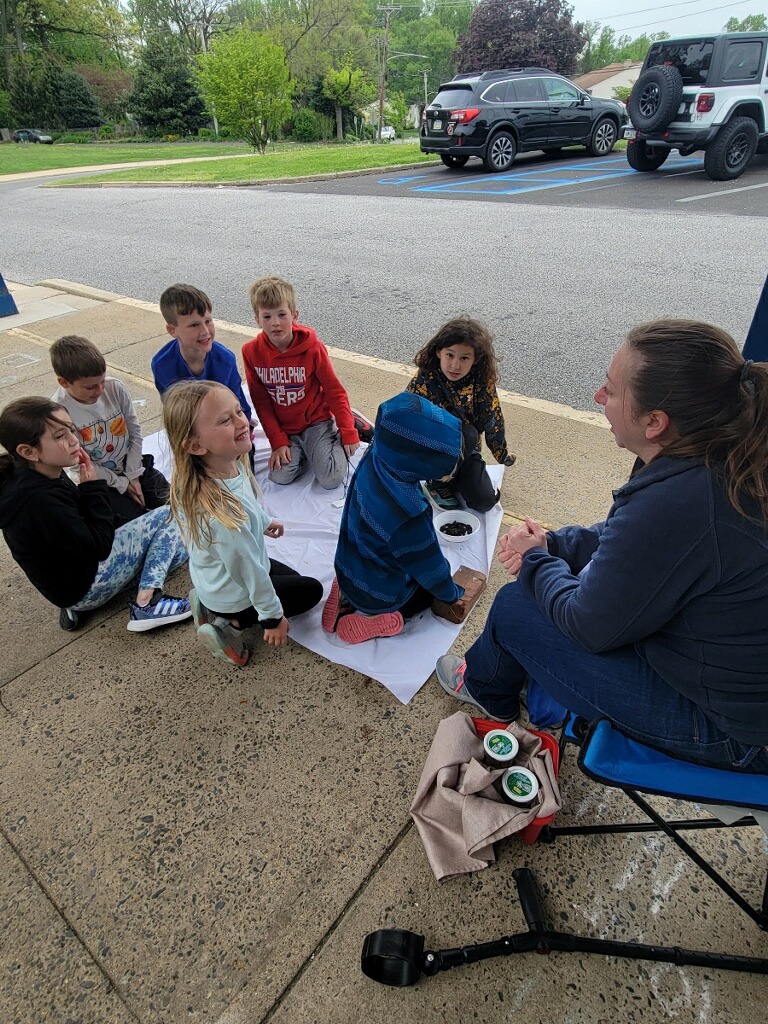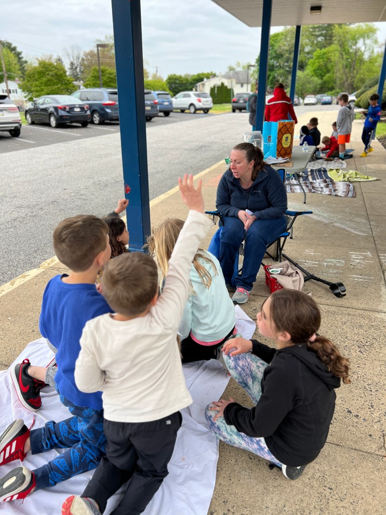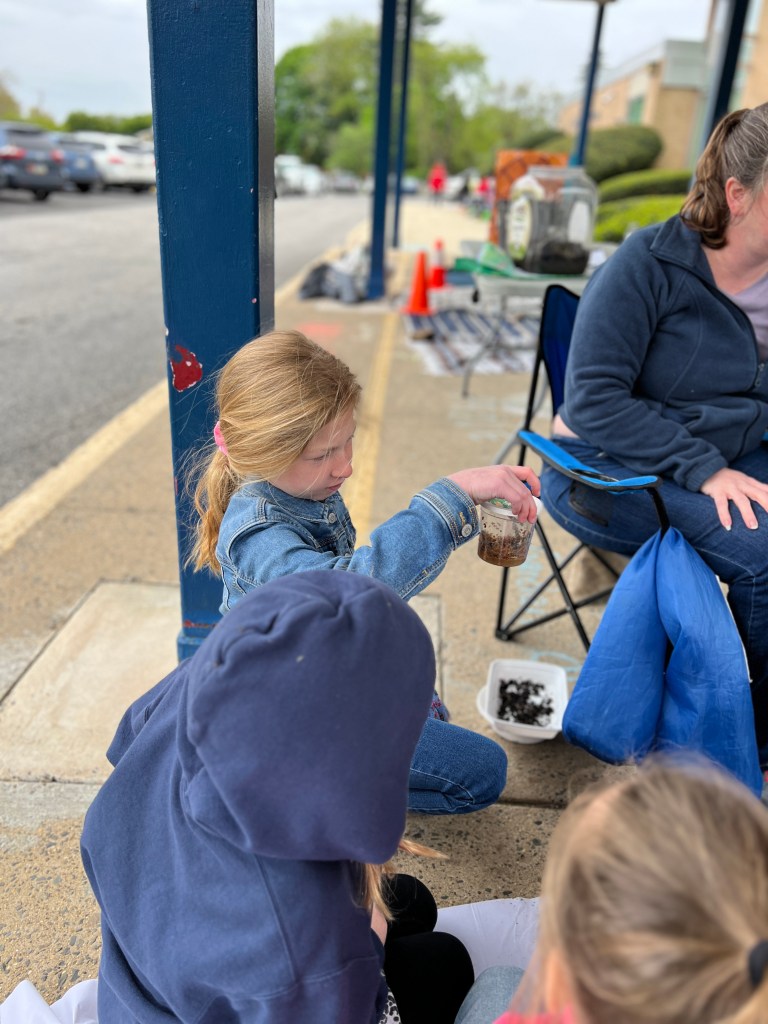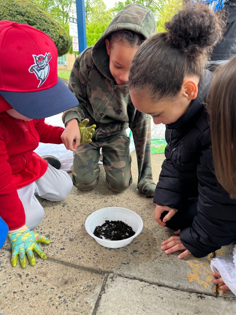 Due to the weather we had to pivot our plans, deciding to stay under the cover out front and enjoyed a picnic lunch while discovering nature. We split into groups: Mrs Nyszczot’s group did gardening like pulling weeds at our front entrance, seeing painted lady caterpillars up close, and planting indoor seeds for the “three sisters” (corn, squash, beans), learning about the safety rules needed in the garden.