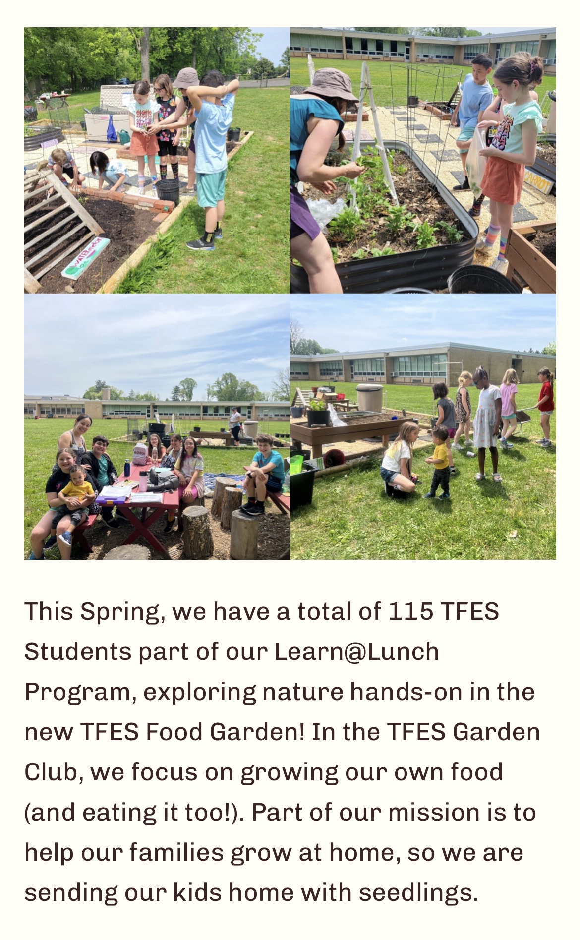 This Spring, we have a total of 115 TFES Students part of our Learn@Lunch Program, exploring nature hands-on in the new TFES Food Garden! In the TFES Garden Club, we focus on growing our own food (and eating it too!). Part of our mission is to help our families grow at home, so we are … Continue reading Student Photos and Instructions for Take-Home Plants— Grow Your Own Food…at Home!!!