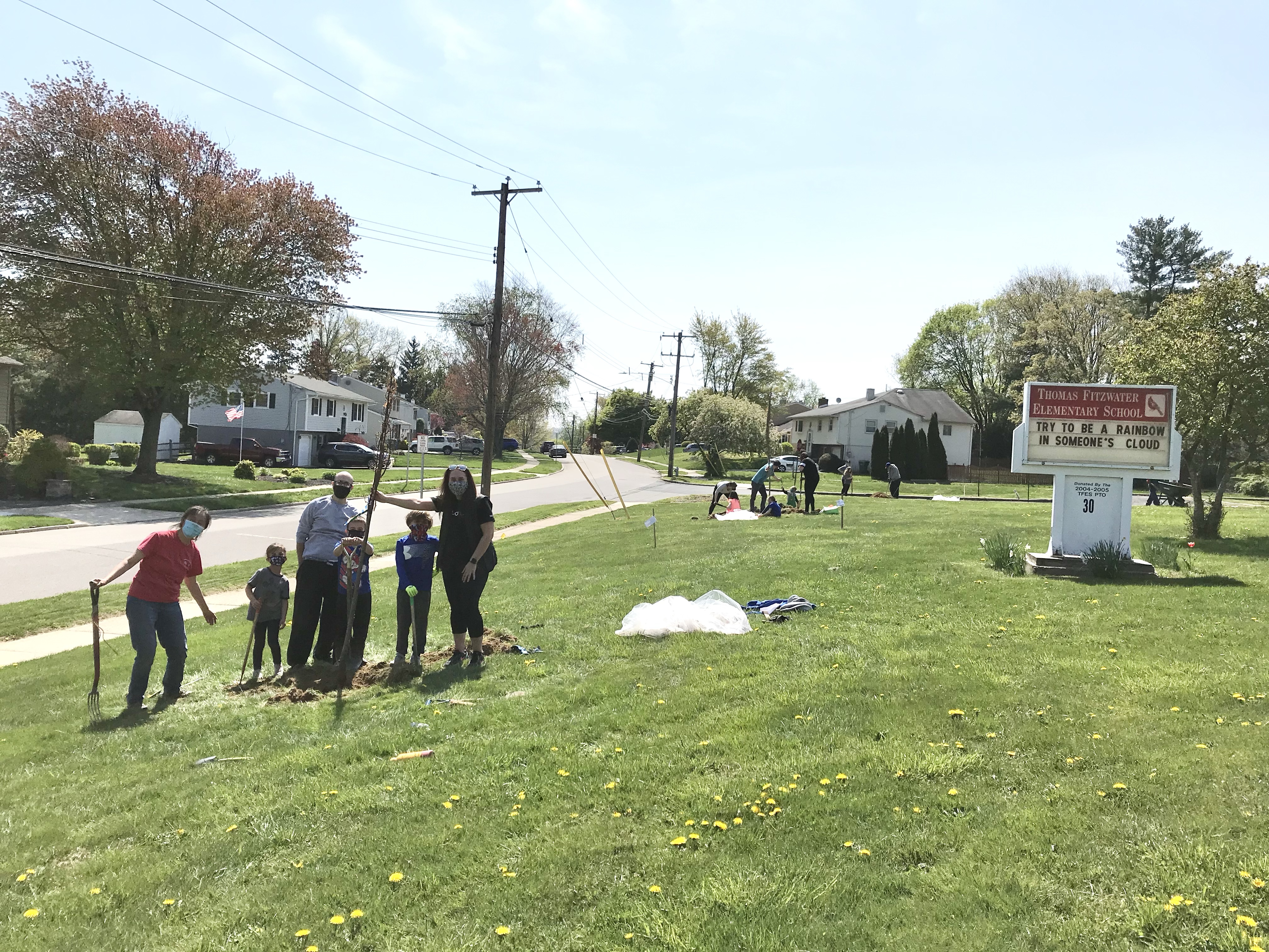 Photo: In 2021, Fan Zhang-Plasket (on left) led the TFES tree planting in front of school with many families and older Upper Dublin students. She has also helped with many other gardening projects around the school and community.