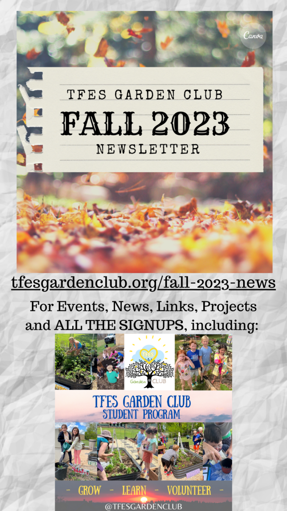 GARDEN CLUB – FALL 2023 NEWSLETTER Checkout the Garden Club’s Fall 2023 Newsletter for Student Signups, Family Event Schedule, planting projects and other Garden News at https://tfesgardenclub.org/fall-2023-news/
