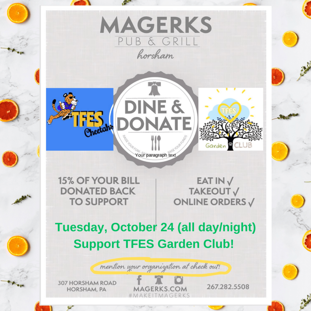 Tuesday, October 24th (all day/night): Dine & Donate Fundraiser and Magerks Horsham. Dine in, take out, grab a drink – just be sure to tell your server. More info at
