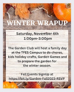 Please support the Garden Club’s front entrance project and the Food Garden at TFES!Join us on Saturday, November 4th, 1-3pm: Family Fun & Winter WrapUp. More info at https://bit.ly/TFES-WW-Nov4. Thanks to Allied for discounted mulch and for Bill Johnston Landscaping for free delivery.