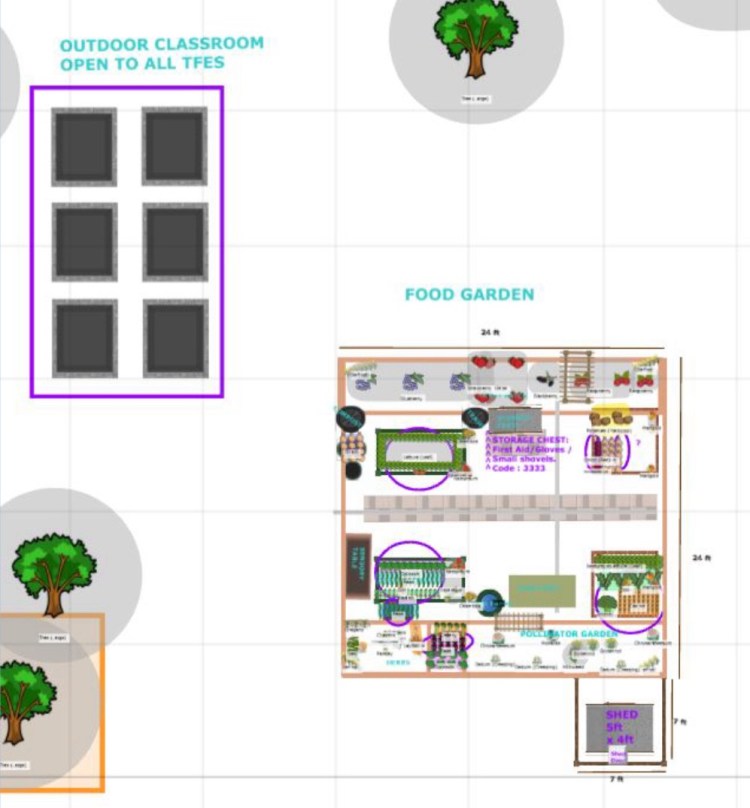 The Outdoor Classroom is next to the TFES Food Garden (see map). Along with the seating, our TFES teachers can educate utilizing the food-producing garden, sensory table and neighboring pollinator garden.