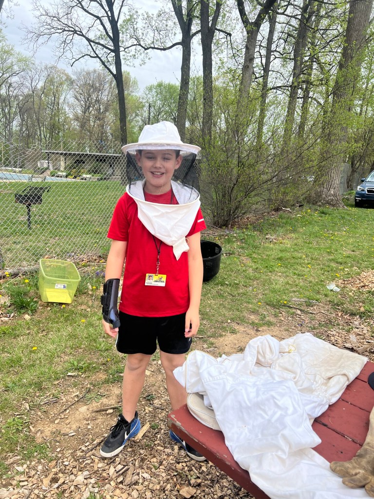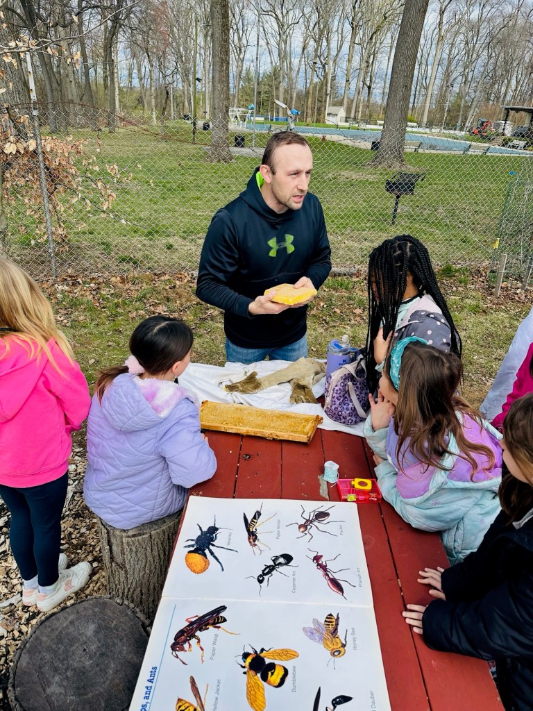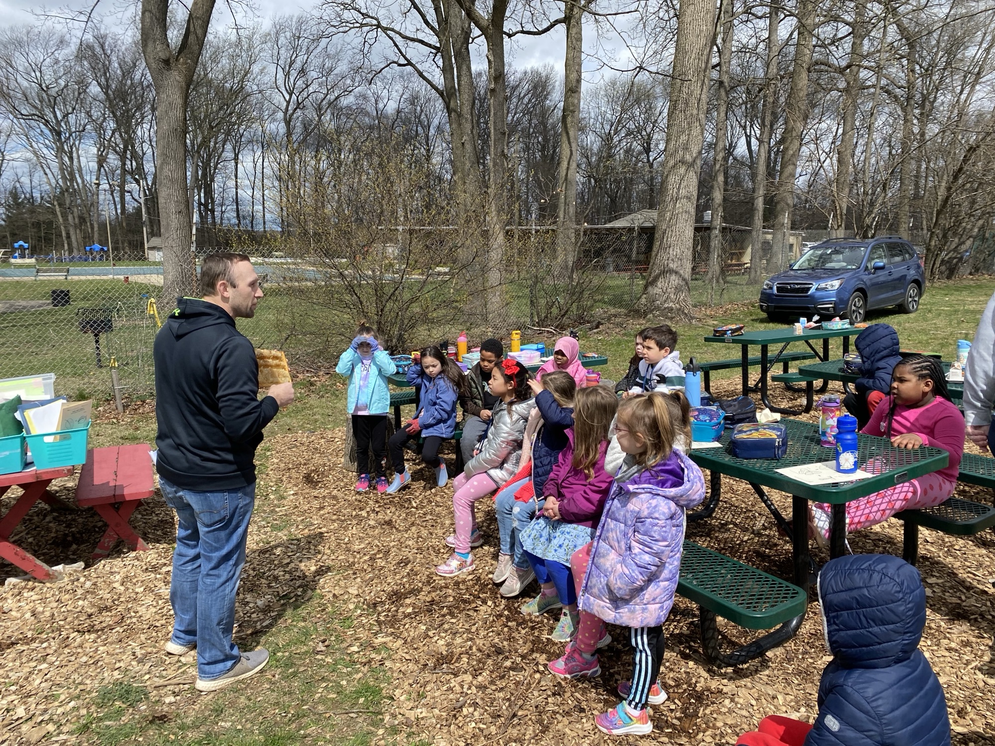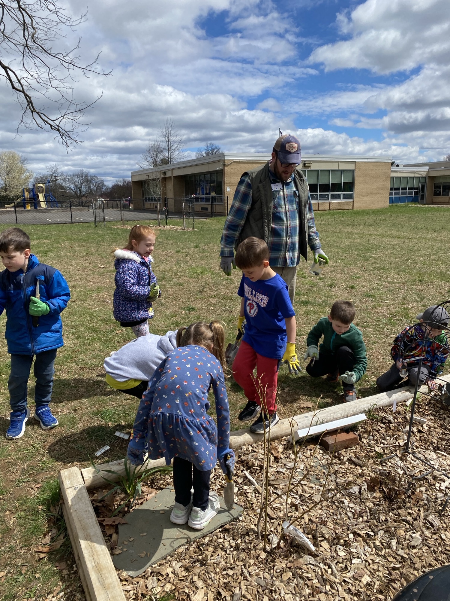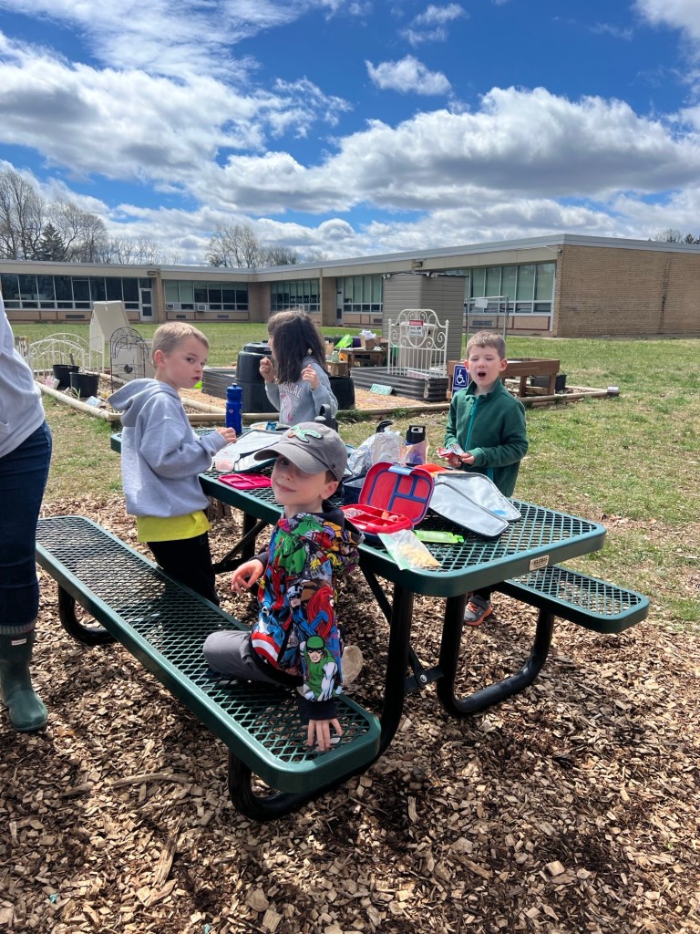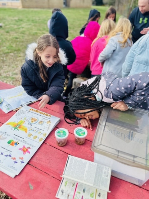 After enjoying a picnic lunch at the TFES Food Garden / New Outdoor Classroom. We are so thankful to Mr Springer for helping us teach in Garden Club this school year. Using station rotations, Mr Springer taught our classes about “Helper Bugs”. Did you know that Mr Springer is not just a gym teacher, but he is also a farmer and a bee keeper. The students were excited to see live caterpillars/chrysalises/butterflies, see worms up close, types of dead bees, and trying on a bee-keepers hat! We also got to utilize butterfly and insect educational materials donated by the Camden Children’s Garden.
