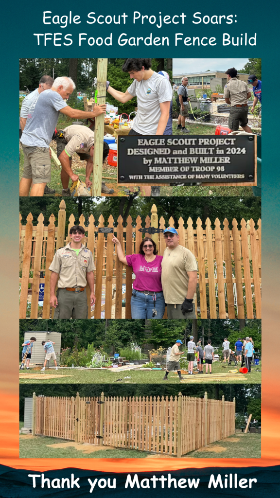 Due to deer and vandalism, the TFES Garden Club made a difficult decision to have a fence built around the TFES Food Garden. The Food Garden’s security fell to the wayside, with time/money budgeted towards other Garden Club projects, like the outdoor classroom, TFES front entrance, and funding the Garden’s Student Program activities.