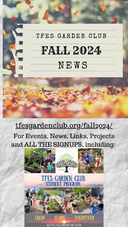 Checkout the Garden Club’s Fall 2024 Newsletter for Student Signups, Event Schedule, and other Garden News at https://tfesgardenclub.org/fall2024/.