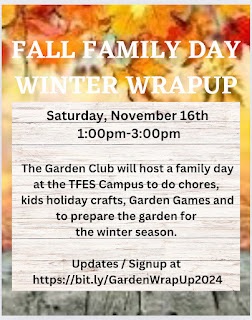 Join us Saturday, November 16th Family Event 1pm-3pm @TFES – More info/RSVP at https://bit.ly/GardenWrapUp2024.