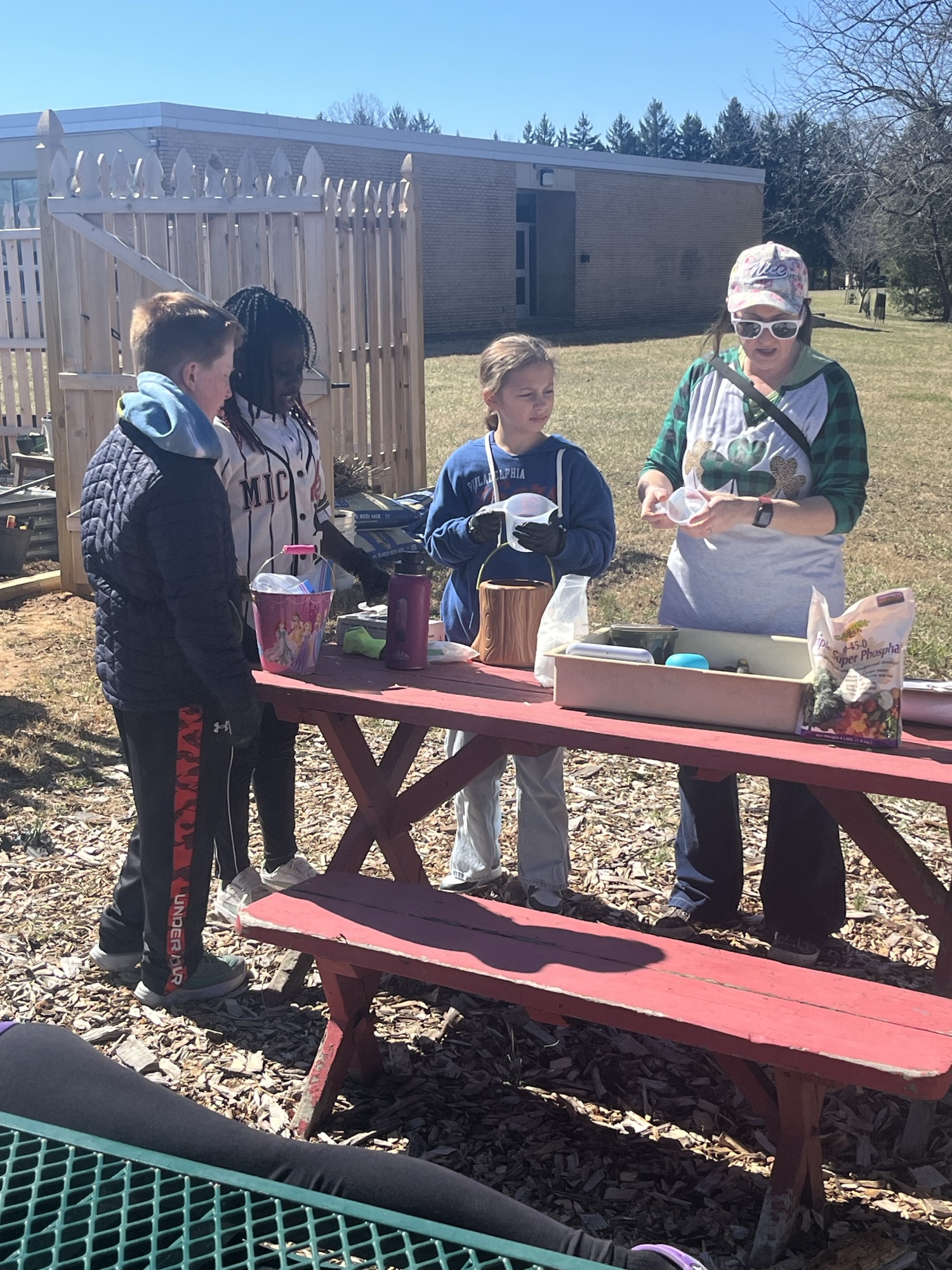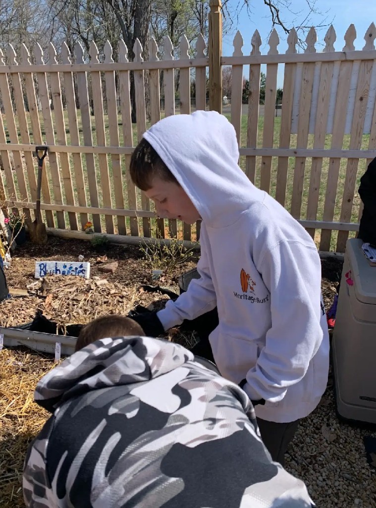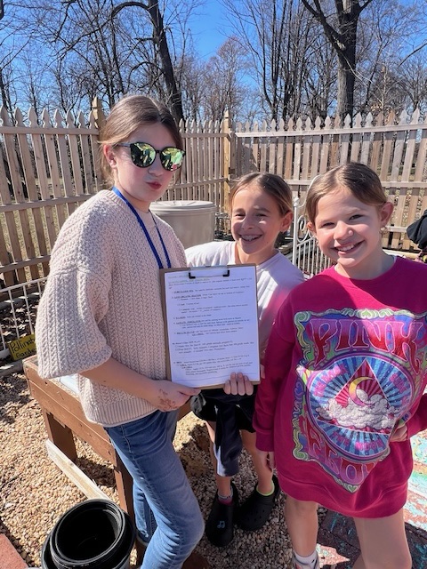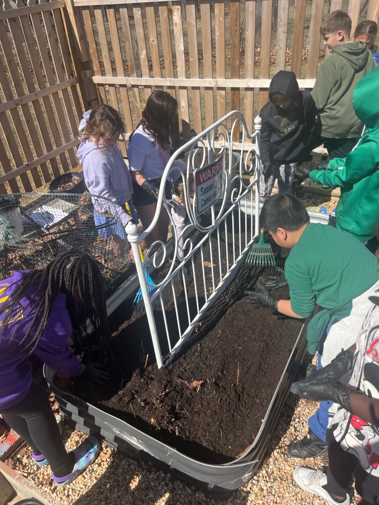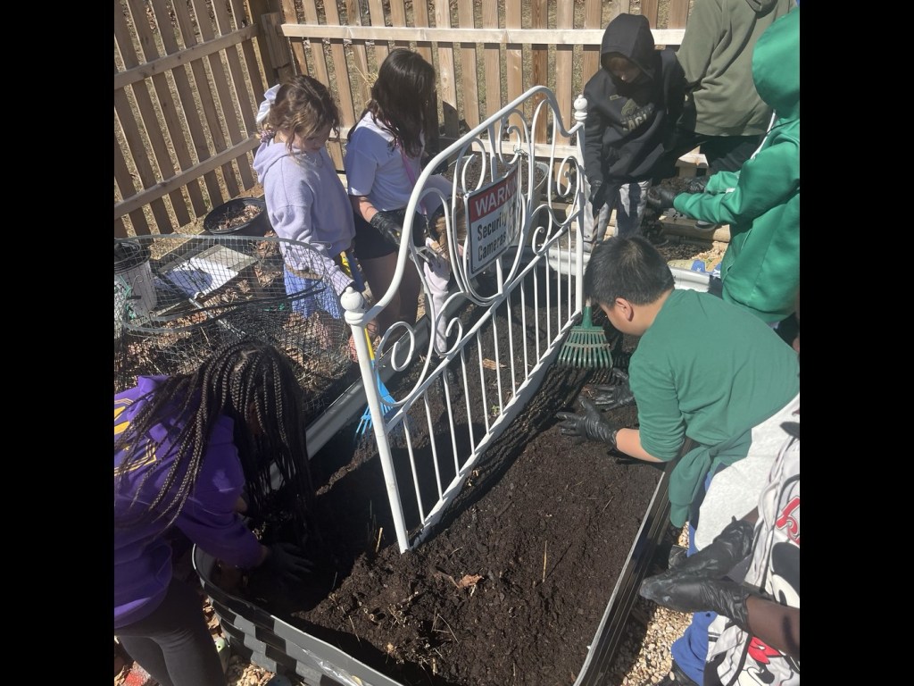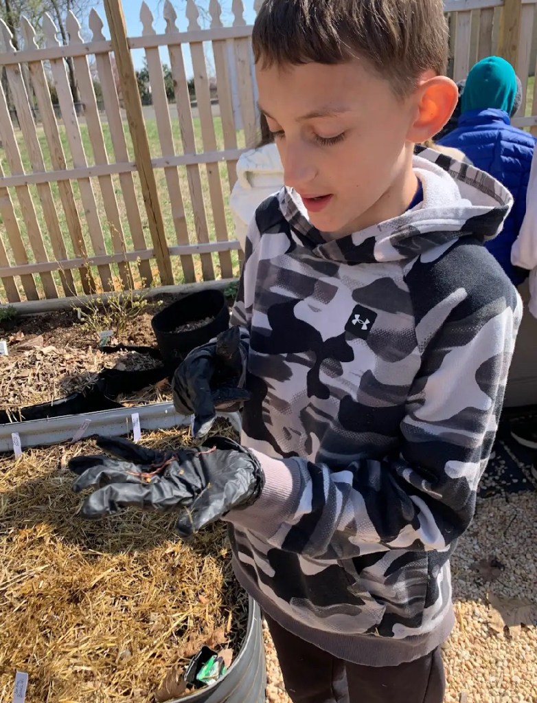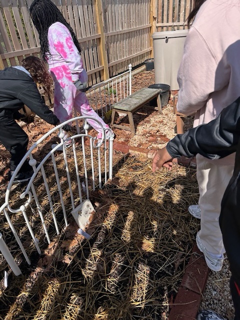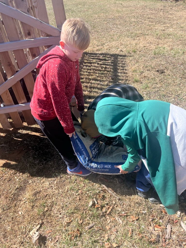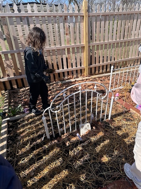 We learned how soil needs nutrients, like we take vitamins when our diet may not have all we need. These nutrients (aka fertilizers are raw elements like nitrogen, phosphate, magnesium, sulfur, and gypsum), are rare to handle in another pragmatic setting. We discussed how different plants have preferences of fertilizer based on their PH scale, but most of our veggies/vine-fruits prefer similar soils with a balance of the nutrients. We learned about and added organic matter: Decaying plant (humus), like compost aka black gold, cow manure and soil. Fertilizing and then adding a top layer of free mulch (straw and fallen leaves, which will decompose to add in even more nutrients to our soil).