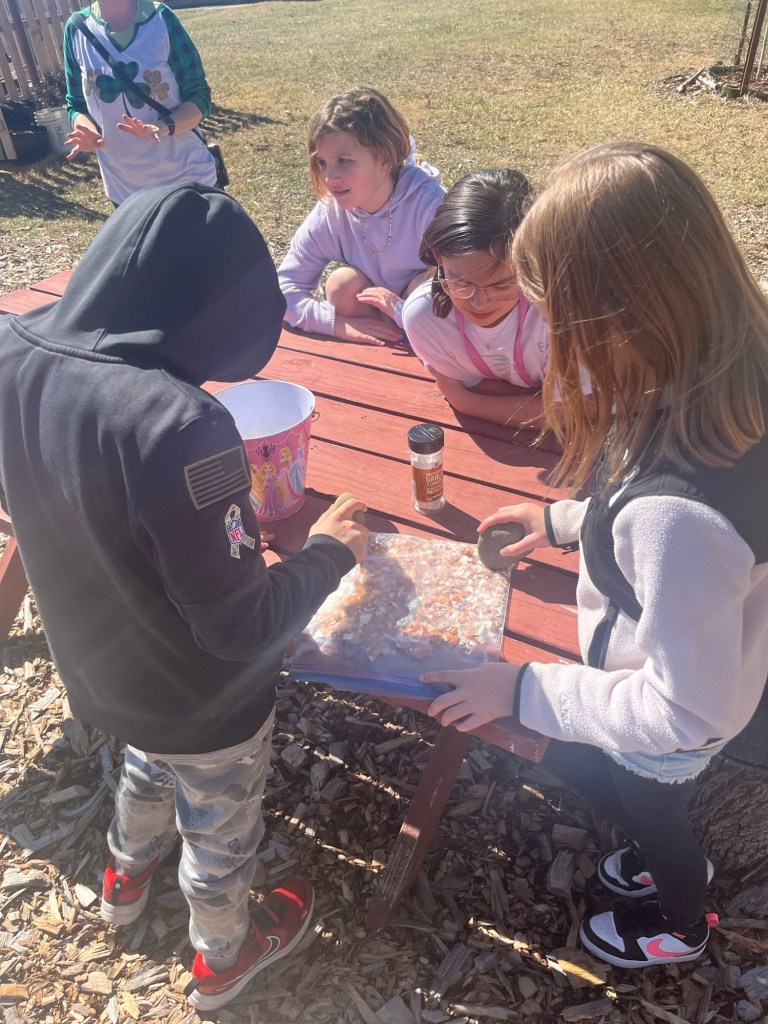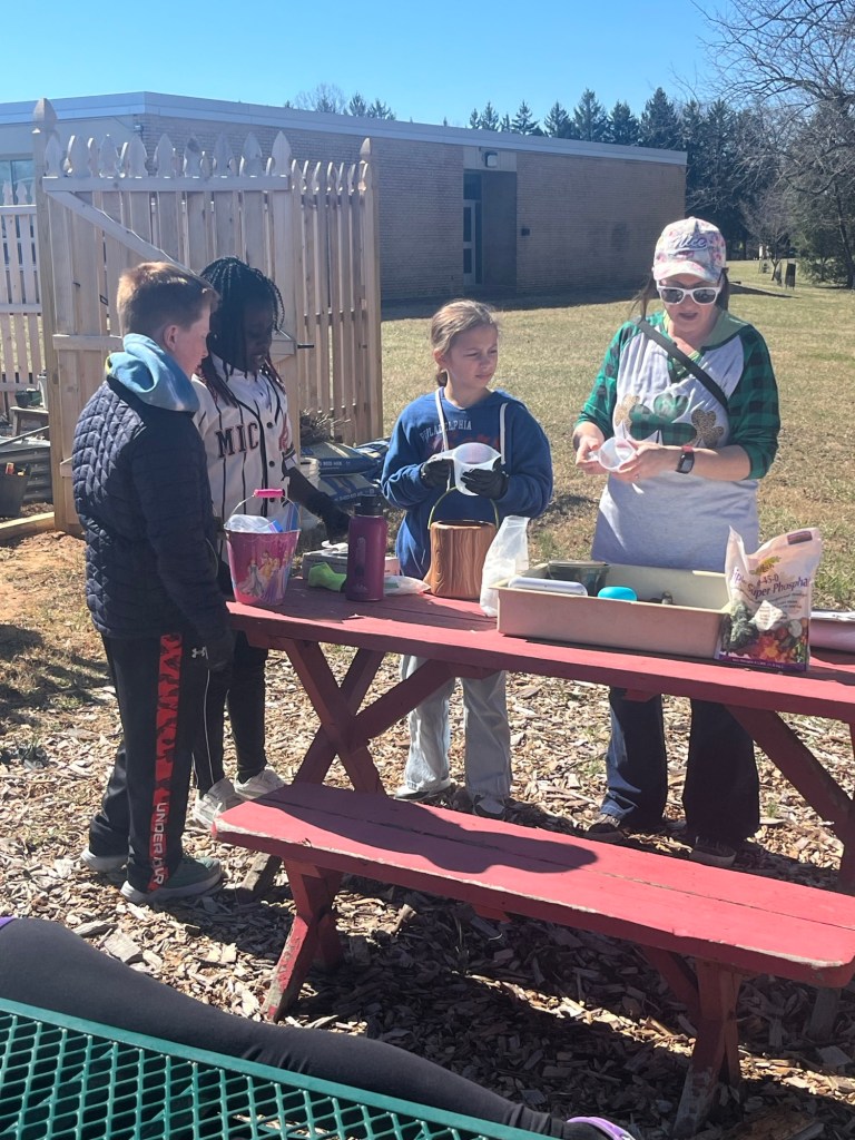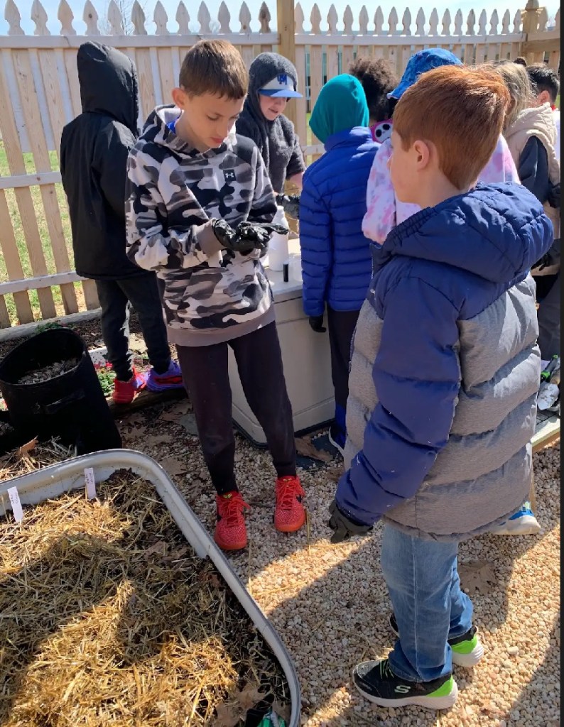 A 5th grade class and all the 4th grade classes joined us in the TFES Food Garden to help us correct our soil and prepare our beds for planting! With the help of Penn State University’s Agriculture Department, we had our soil tested. We used the reports, as we applied math and soil science to practical use! Read about the specific lessons learned. As much as the kids enjoyed learning outdoors and getting dirty, they LOVED the worms. Worms are our friendly garden bugs, who aerate the soil, decompose organic materials and pooh nutrients!