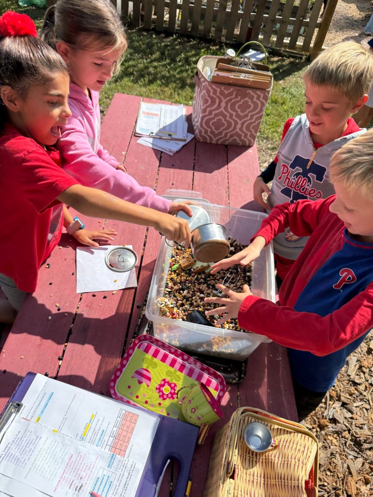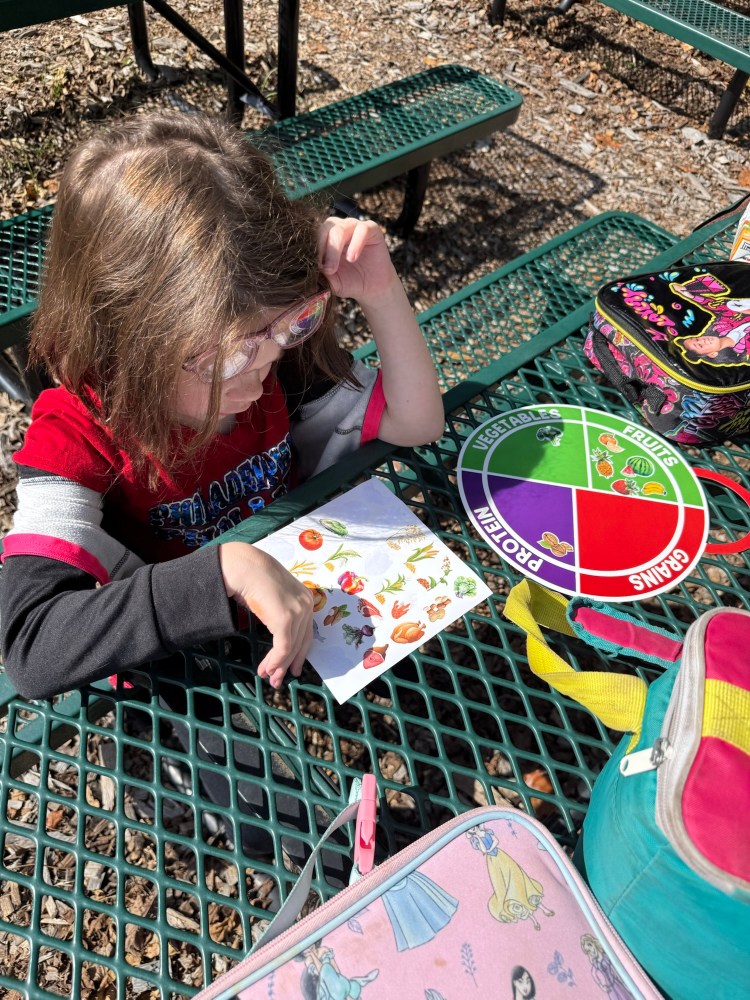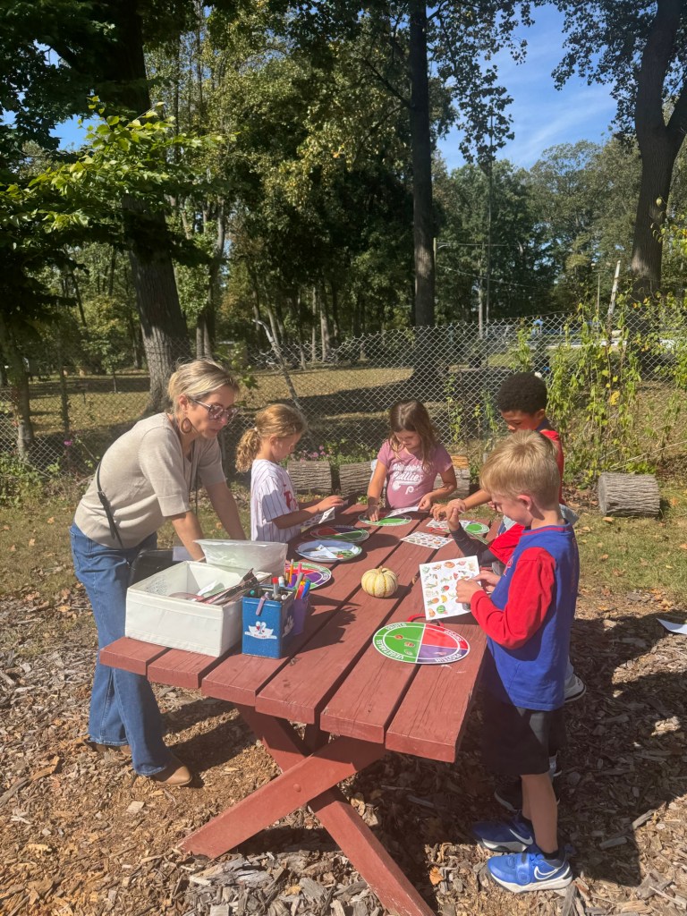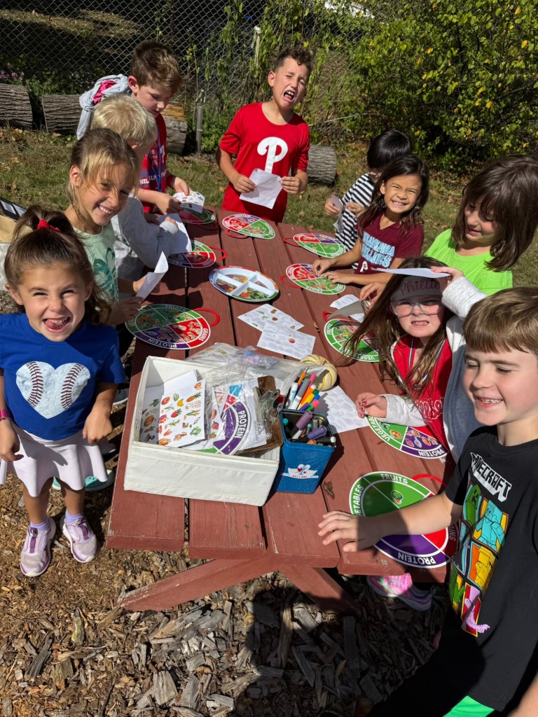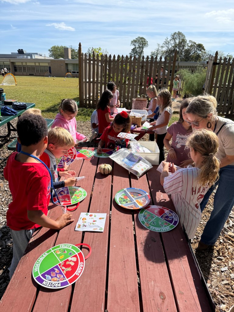 For our first classes in the garden, station #1 in the Outdoor Classroom, focused on the MyPlate Food Groups. Led by Candice Sblacio and Jess Neff, students learned about the importance of eating from the food groups. Students brought home a myplate activity with stickers. Kids also enjoyed playing with the sensory bin “the seeds we eat” with beans, peas, corn, rice, and lentils. We also talked about making healthy choices and trying to represent the food groups in our meal (my plate).