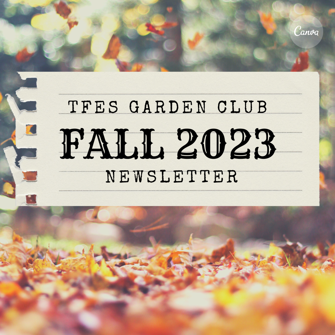 GARDEN CLUB – FALL 2023 NEWSLETTER Checkout the Garden Club’s Fall 2023 Newsletter for Student Signups, Family Event Schedule, planting projects and other Garden News at https://tfesgardenclub.org/fall-2023-news/ SIGNUPS – STUDENT PROGRAM @LUNCH – DEADLINE FOR K-2nd Fall Program is Oct 2nd! Deadline for 3rd-5th grades is Oct 14. UPDATED MEMBERSHIP FORMS NEEDED EACH SCHOOL YEAR.Continue reading “GARDEN CLUB – FALL 2023 NEWSLETTER “