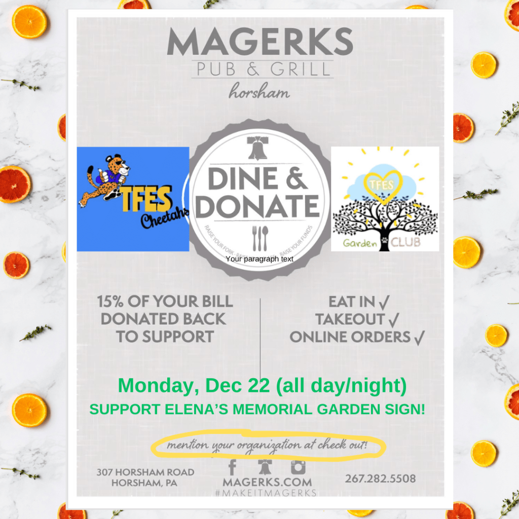 Take a break from shopping and cooking any time on Dec 22nd! Let’s get together for some holiday cheer with lunch/dinner dine-in or takeout at Magerks Horsham. Save the date for this Dine & Donate to help us raise funds for dedication signage for our sweet Elena’s garden at the front of TFES 🌸🦋. Thank you to Magerks for pledging 15% of orders that day. We only get the donation IF our supporters tell their waiters or takeout team that they are supporting the Dine & Donate for “Elena’s Memorial Garden” – only on December 22 at Magerks Horsham.