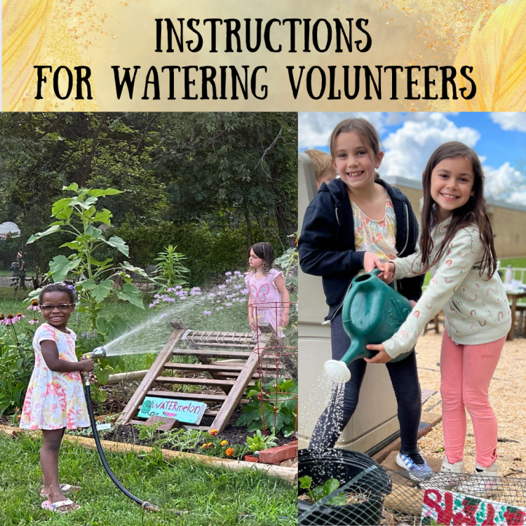 Please see the instructions for the specific garden that you are signed up to water (Front Gardens) OR Food Garden – located between garden and swim club) .